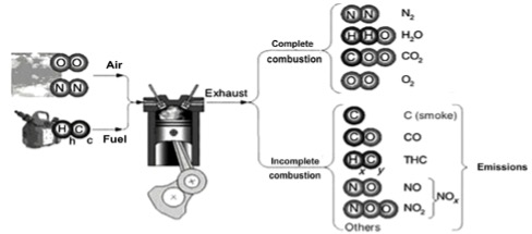 Неполное сгорание: при недостатке кислорода или других неблагоприятных условиях образуются вредные вещества, такие как угарный газ (CO), несгоревшие углеводороды (HC), сажа, оксиды азота. В странах с высоким стандартом топлива не сгорает до 7%. В странах с низким стандартом топлива эта цифра может быть существенно выше, до 10-20%.