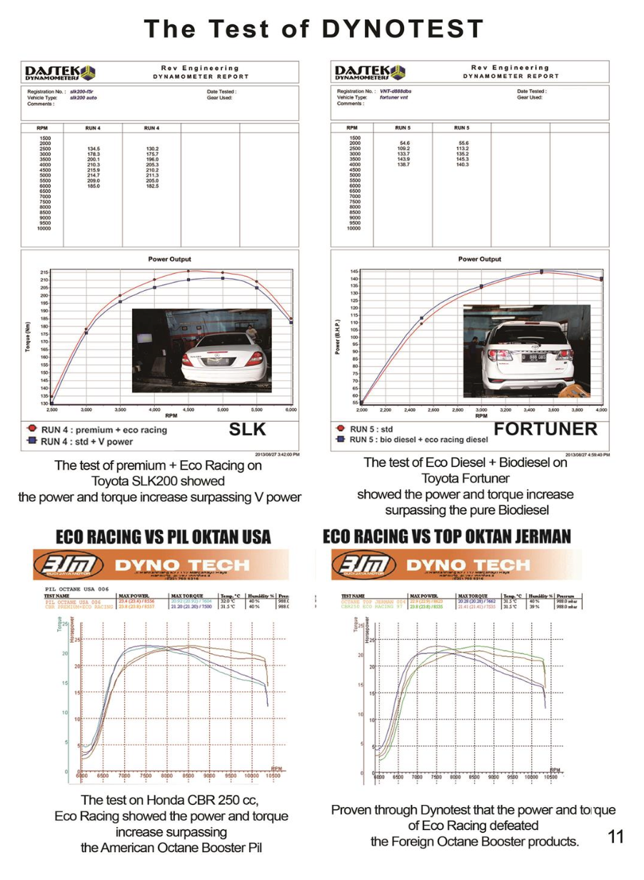 Eco racing/eco diesel — твердая таблетка, произведенная в Индонезии из 100% растительного сырья, которая способствует более полному сгоранию топлива в камере сгорания, повышая его отдачу. Она оптимизирует работу двигателя и эффективность топлива благодаря инновационному решению процесса горения для дизельных и бензиновых двигателей.